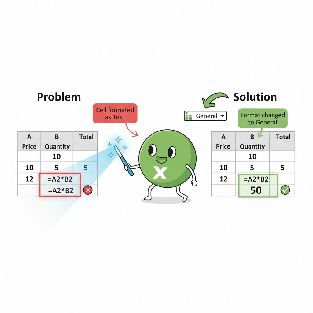 最も多い原因は、数式を入力したセルの表示形式が「文字列」になっているケースだね。セルが「文字列」に設定されていると、Excelは入力されたものを計算式ではなく、ただの文字として扱ってしまうんだ。